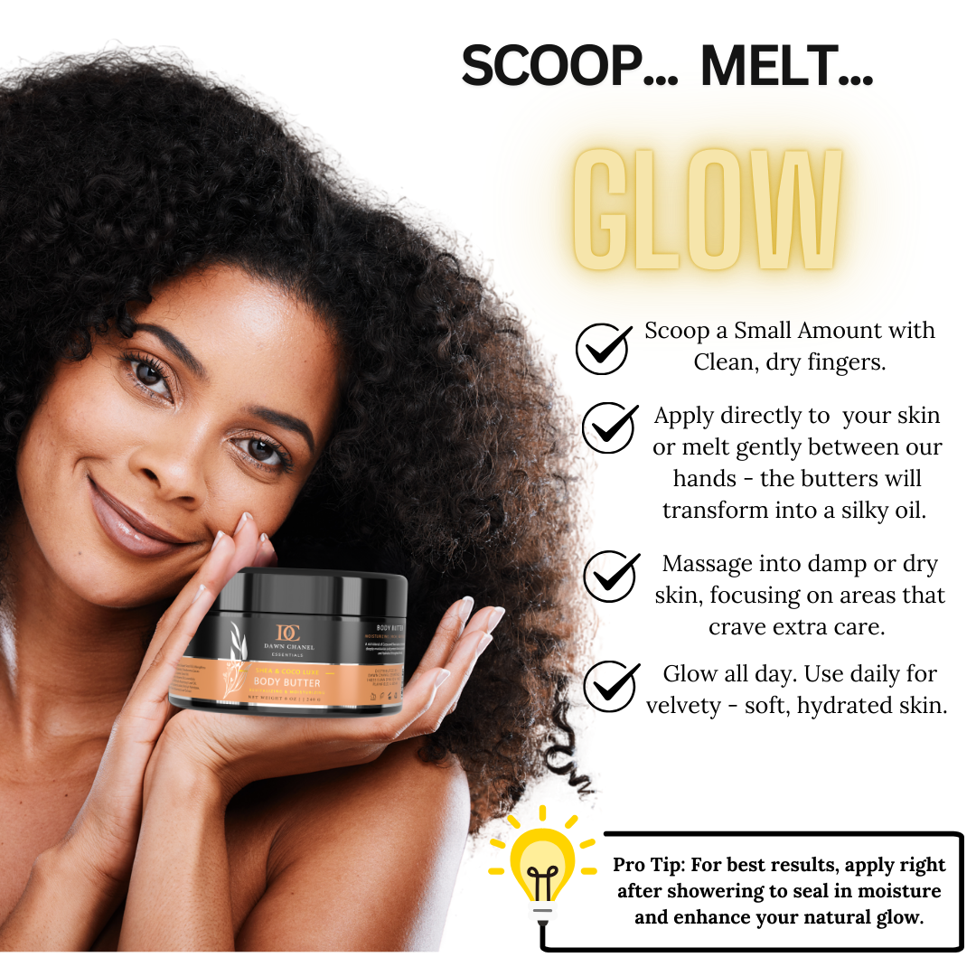 For best results, apply generously after a shower or bath, when your skin is most receptive. Warm a small amount between your hands and gently massage into damp skin, focusing on areas prone to dryness like elbows, knees, and feet. Use circular motions to allow the butter to fully absorb. Enjoy the luxurious texture and scent as it leaves your skin feeling deeply hydrated, soft, and glowing. Use daily for lasting hydration and healthier-looking skin.
